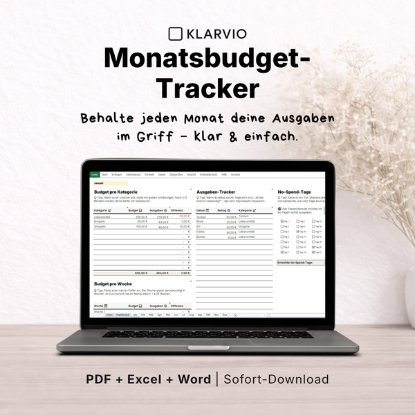 Der KLARVIO Finanzplaner Kompakt hilft dir, endlich den klaren Überblick über dein Geld bekommst, den du dir schon lange wünschst. Alles in einem klar aufgebauten System, das dir jeden Monat Zeit und Stress erspart. Endlich Ordnung in deinen Finanzen - ohne stundenlang Tabellen zu bauen.